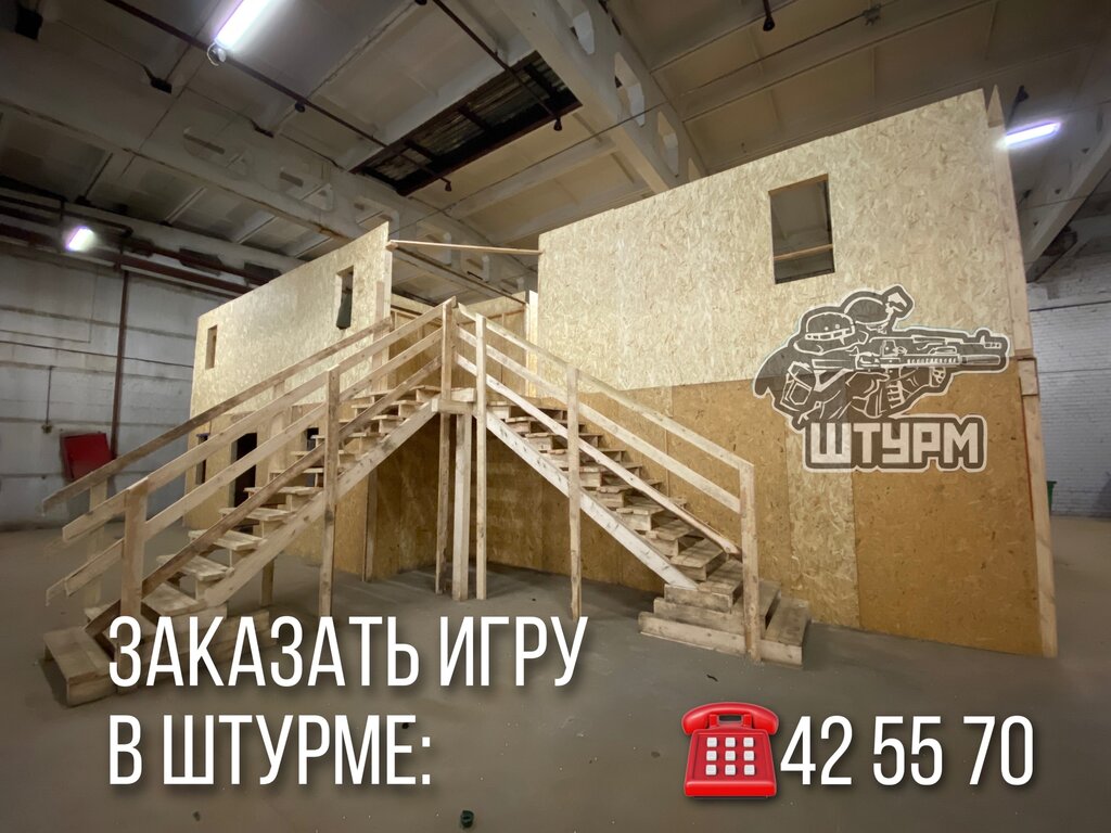 Склад. Внутри просторное помещение, разделённое перегородками, стоит бронетранспортёр и вертолёт. Есть небольшие помещения в которых можно спрятаться и дождаться зазевавшегося противника. Есть комнаты отдыха. Для нетребовательной команды, которая хочет поиграть в страйкбол или лазертаг самое то.