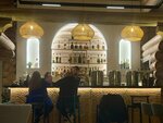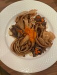 Запланировала посещение ресторана именно на масленицу: сперва погулять на территории, посмотреть на праздник, а потом поесть блинов. И насколько огорчила организация «народного гуляния», настолько порадовал ужин. Вежливый персонал на входе, гардероб. Официанты стараются ответить всем и оперативно обслужить, несмотря на полную посадку и лист ожидания. Меню не испугало небольшим выбором блюд (в отличие от орфографических ошибок в нём 🫣). Позиций достаточно, чтобы полноценно сытно поесть. Подача достаточно быстрая (по опыту других петергофских загородных ресторанов с ожиданием салата больше получаса) – за 20 минут были поданы первые блюда. (! Полная посадка при этом). Как замечание, обещанный быстро сбитень почему-то был ненамного быстрее еды, хотя бар не оставил впечатления загруженного выполнением заказов. По еде: Выбрала грибной суп — ароматный, аппетитный, очень хороший. Единственный нюанс — попросила подогреть. Сделали без вопросов. Блин с уткой — очень вкусно, необычно и красиво! Креп Сюзетт на десерт — уже был съеден на фоне сытости. Интересный вариант сладкого блина. Немного чувствовался алкоголь (в меню указан апельсиновый соус на коньяке). Кофе… ужасен. Горелый, горький. Но почему-то и не ждала качественного зерна здесь. А хотелось бы, чтобы и кофе соответствовал уровню заведения. Официанты своевременно забирали посуду, интересовались, всё ли хорошо. Движуха у бара, где сидели сотрудники, судя по их общению, в какой-то момент превратилась в колхозное обсуждение своих дел. Особенно неприятно было при затихшей музыке. Музыка же живая — очень громкая, намного громче фоновой. Вроде не дискотека, общаться за столиком невозможно, нужно повышать голос. Администратор приветлива и дружелюбна, ответила на вопросы о бронировании и изменениях в меню. Собственно, возвращение уже запланировано, столик зарезервирован. Интересно попробовать другие позиции меню (надеюсь, ошибки в нём исправят). Вкусная еда сделала этот вечер прекрасным.