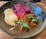 Был здесь со своей девушкой 1-ого января. Несмотря на плотную посадку, блюда подали быстро, и их качество, вкус, количество, аромат не пострадали: нежные сырные шарики с не менее нежным вареньем "белая черешня", сочные хинкали с телятиной и бараниной, сырная горячая ачма и ароматно-вкусный фирменный чай "Чёрная смородина с базиликом" порадовали мой желудок; Хостесс отнеслась с пониманием к моей цели освободиться от зависимости от телефона и, чтобы ожидание блюд (13 минут) не было скучным, дала нам раскраски, журнал и вырезных кабанчиков, которых я назвал Ниф-ниф, Нуф-нуф, Наф-наф и Елисей. Отдельное спасибо нашему официанту: профессионализм, вайбовость, приятная внешность и большое количество личных достижений, которые отражают ордена на его фартуке - всё это наш официант Алишер. Точно придём сюда ещё раз!
