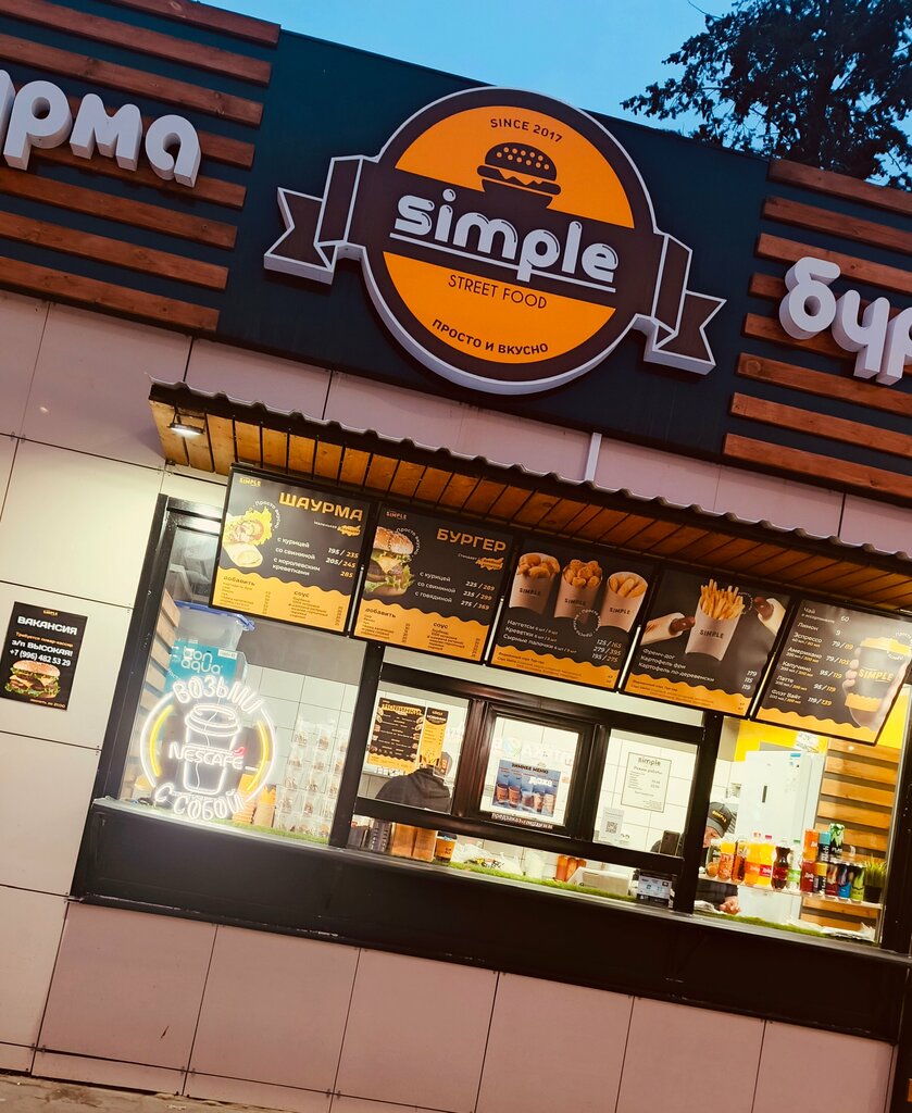 Давно подсели на Simple! Пробовали шаурму везде, остались здесь, не сравнится с другими: вкусно, сочно, качественно, свежие продукты, и наглядно видно как ребята готовят для Вас! Дети любят бургеры, да и многое другое. Можно выбирать разные добавки на Ваш вкус! Ребята внимательные, доброжелательные, если очень загружены ( а это признак востребовательности👆) то предупреждают, что ожидание дольше, чем обычно. На прогулку в холоднее время можно взять у них горячий глинтвейн или кофе. Есть новиночки в меню , которые еще не пробовала, но обязательно попробую! Советую однозначно! Ребятам удачи и развития 😉