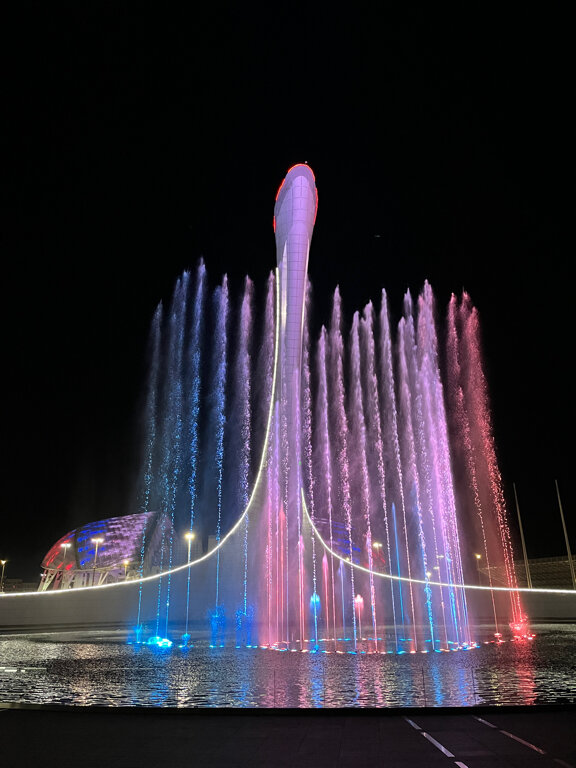 Даже если Вы раньше и бывали на шоу фонтана "Чаша олимпийского огня", все равно непременно стОит приехать ещё и ещё! Новая программа, запущенная осенью 25-го года, впечатляет! Особенно мне понравился джаз, который проходит по субботам. Каждый день программа разная, стили музыкальные меняются. Согласно расписанию на зимний сезон 25/26, шоу начинаются в 6 вечера и продолжаются ровно час Из центра Адлера проще и быстрее всего доехать до стадиона "Фишт" на автобусах 535 и 557. Цена проезда - 76 рублей.