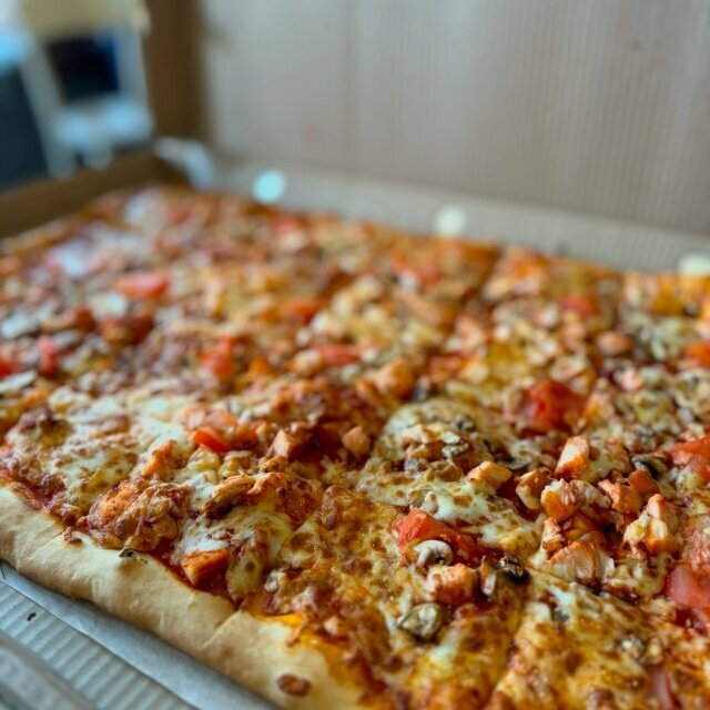 Пицца внушительного размера 43 см с сочной копчёной курицей, ветчиной и шампиньонами. Помидоры и орегано добавляют свежесть, а сыр создаёт тягучую текстуру. Соус гармонично объединяет все вкусы
