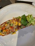 Вкусный овощной тар-тар из авокадо, огурца, вяленых томатов, зелёного лука с зелёным маслом и землёй из маслин 200 гр.