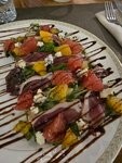 Тонко порезанное говяжье мясо с миксом салатов, вялеными помидорами, каперсами, приправленные оливковым маслом, зернистой горчицей и бальзамическим уксусом 210 гр. 428 ккал