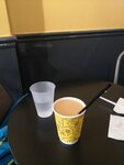 Зашла пересидеть 20 минут до поликлиники. Там, как всегда, чисто; встречает приветливая сестра. В холодильнике не нашлось простой воды, однако мне без заказа предложили бесплатно стакан чистой воды (на фото). Я не люблю кофе с пенкой от молока, потому что мешает размешивать сахар. Пенка в итоге сладкая, а кофе не очень. Сестра предложила добавить молоко, горячее или холодное, в американо. Это не сервис, это по-сестрински!