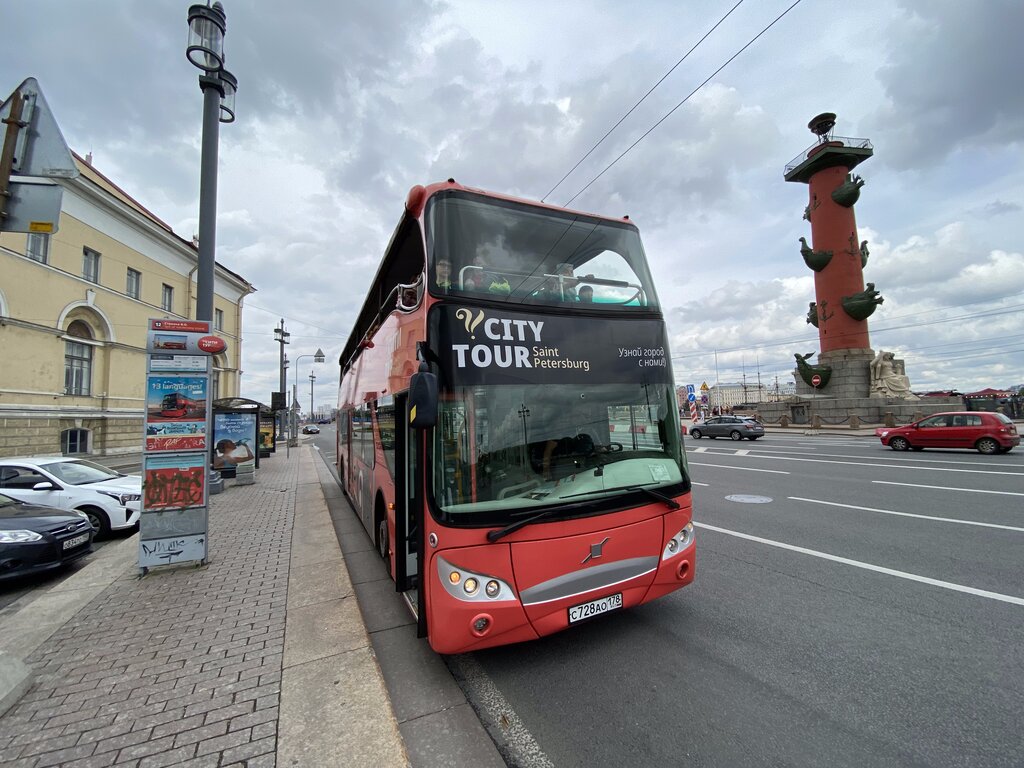 Были на обзорной экскурсии по Петербургу на двухэтажных автобусах. Отлично всё видно на втором этаже, наушники в подарок, аудиогид четко попадает по маршруту, ща что спасибо большое водителю, который умело координирует экскурсию. Советую проехать, кто не ездил. Билеты действуют 24 и 48 часов, все зависит от цены. Но модно выйти на любой из 12 остановок и сесть в течение 24 ч. Или 48 ч. Также. Либо проехать несколько раз по маршруту, что удобно.