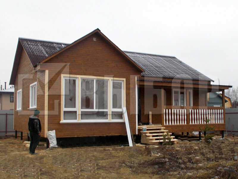 Характеристики Размеры объекта: 8 на 11 м Срок постройки (дней): 14 Гарантия: 3 года Дополнительно Терраса, Крыльцо Общие данные Сборка дома: Входит в стоимость. Высота потолков: Высота от пола до потолка – 2,4 м Фундамент Фундамент: Не входит в с...