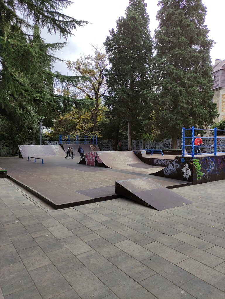 Ставлю за местоположение твердую пятерку! В тени хвои, уютный сквер, приятнейший воздух! Место создано для катания! Но! В углу парка сидят какие-то синяки, жрут водку уже с самого утра. Площадка засыпана иголками, но это не беда. Беда - это лужи, которые не сохнут, это обшарпанное покрытие фигур, сквозные дыры в некоторых местах. Ну короче, сама площадка в аварийном состоянии, о чем говорит табличка на рампе. Но кататься можно, если осторожно ;-). Сами фигуры, конечно, мелкие и резкие, видно, что для детей делали. Для начинающих самое оно. Говорят, что будут сносить, и строить чтото другое ... Очень надеюсь, что возведут бетонный парк! От бетонного намного меньше грохота и больше безопасности. Надеюсь, власти города посоветуются с про-райдерами и построят лучше чем в Симеизе! Место 100500% заслуживает полноценного современного бетонного скейт-парка!