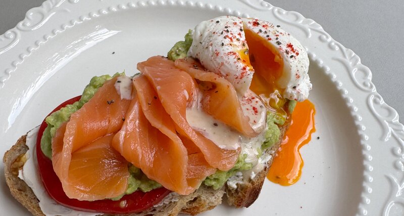 Лосось с/с, яйца-пашот, ремесленный хлеб, сливочный сыр,авокадо, ореховый соус, томат