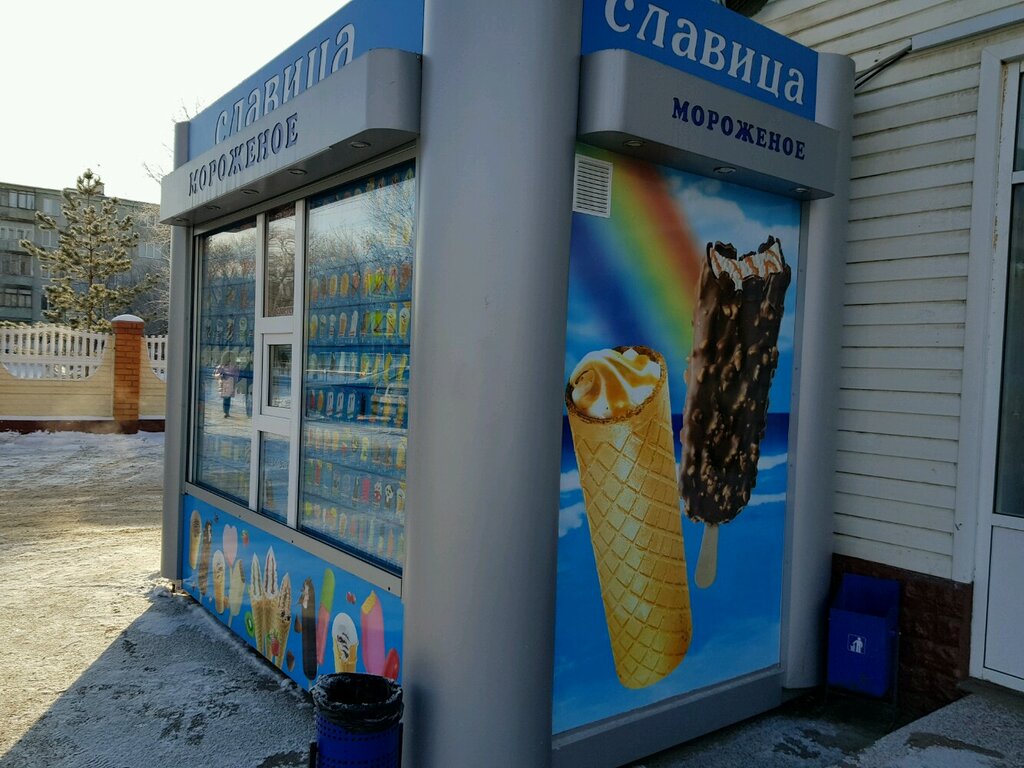 Киоски Славица рекомендую всем любителям мороженого. Очень удобная витрина, фото, состав, цена - все доступно вашим глазам,, а не как в магазинах, где мороженое навалено кучей и не понятно где цена и из чего сделано. Есть и недорогое совсем мороженое с заменителями молочного жира, и натуральное. Цены приемлемые нашему населению. И особенно сливочный пломбир напоминает то мороженое, которое мы любили в Советском Союзе. Очень вкусно.