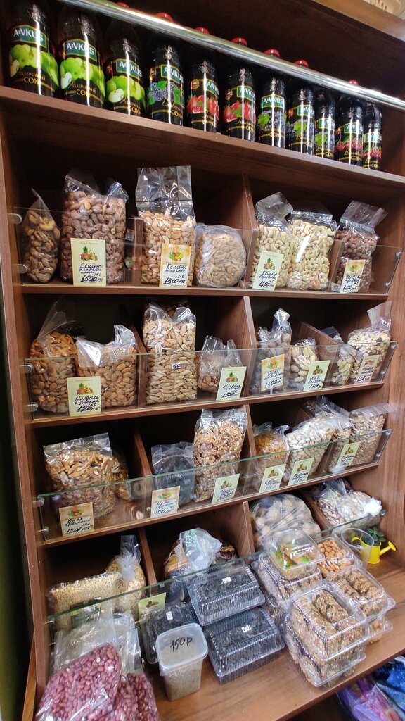 Хорошие овощи и фрукты. Свежие. Продавщица с этого отдела хорошая, с ней можно и словцом обменяться, и она открытый человек. Орехи тоже отличные, но дорогие страшно. Бабушка (та, которая живёт в этом же районе и мне бабушка по матери) всегда там закупается овощами и фруктами для всей семьи. А так там много чего есть. Куча редких безалкогольных напитков, газировок, шоколадок и прочего добра. Есть даже растительное молоко и небольшое количество веганских ништяков, а это, казалось бы, магазин не сетевой и расположен в жилом доме.