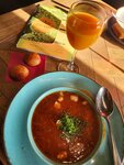 Заехали на обед. Встретили тепло,предупредили что на горячие блюда ожидание.Посадка на летней веранде была полная,внутри были свободные столы ,которые активно резервировались.Видно,что заведение популярное.Цены вполне себе приемлемые,меню разнообразное. Приятный,вежливый персонал. Ждали не долго,минут через 10 уже наши блюда были поданы.Все горячее, порции не маленькие! Заказывали щи и борщ- очень вкусно!!!После такого прекрасного обеда,обязательно приедем к вам как нибудь на ужин!!! Хочется отдельное спасибо сказать за любовь к четвероногим❤️Для меня это большой плюс заведению! Для нашего коржика даже водичку принесли не в пластике🫶Остались под приятным впечатлением. Из Ярославля с ❤️