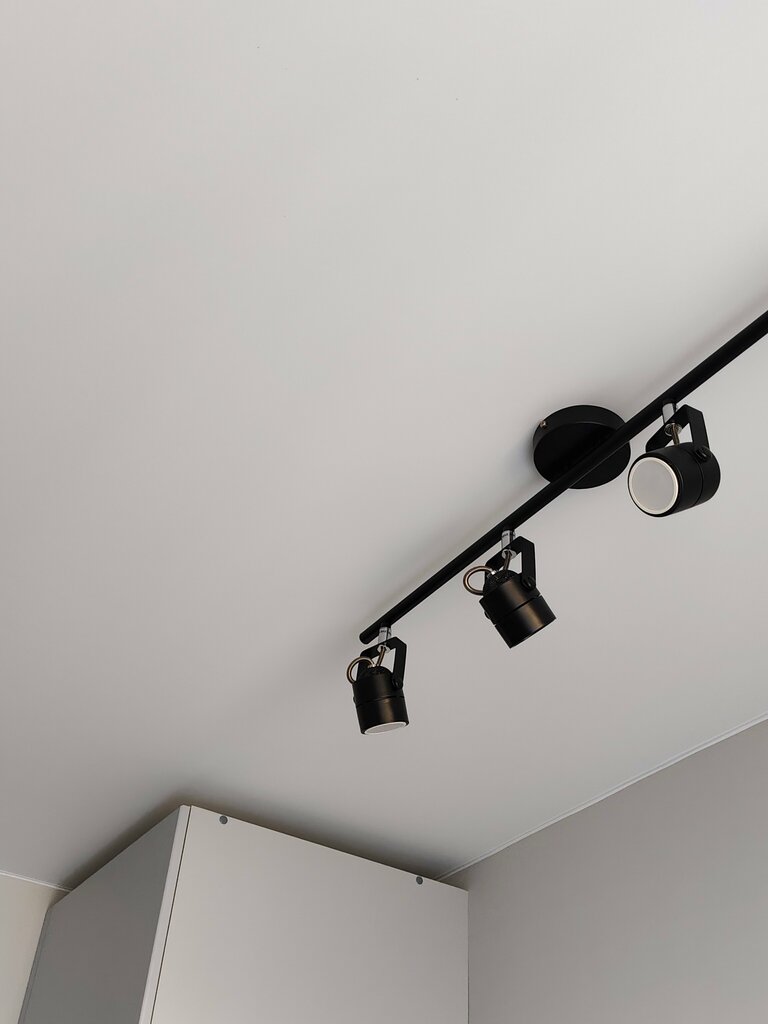 Трек-системы освещения представляют собой гибкие, настраиваемые светильники. На одной полоске крепится несколько ламп во вращающихся плафонах.