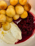 Небольшое заведение в центре города. Столиков 5 разного размера и удобства, мне повезло сесть с нормальной высотой стульев, не микро-диванчики возле низкого стола. Народу много (начало 11-го, будний день), многие уходят не найдя для себя места присесть. Зашла попробовать хит меню - творожники. Заказ подали быстро. Приличная порция нежных творожных шариков, щедрый топинг из сметаны и варенья (на выбор). Обжарка по типу фритюра, но без лишнего масла. Вкус отличный, сладости в меру.
