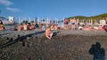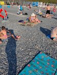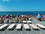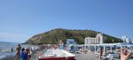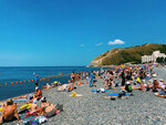 Пляж очень маленький, народу много, почти друг на друге лежат. Если бы было больше места на пляже, было бы здорово. Крупная галька на пляже, заход в море крутой, почти сразу глубина. Море грязноватое, возможно из за штормов, в один день все было в медузах. Есть игровая зона для детей, что очень даже хорошо. Ларьки с едой везде и вдоль пляжа кафешки, шашлыки, рыба.