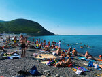 Галечный пляж. Детские лагери закрывают территорию общего пляжа с 10 до 12.00 и с 16 до 18.00. Почти половина пляжа фактически перекрыта. Расположиться там можно, но в часы купания детей без перерыва в громкоговоритель просят переместиться на общую зону. В итоге люби очень плотно расположены, хотя места на пляже достаточно. Вокруг территория огорожена, но не используется, зарастает сорняками. Видимо, принадлежит какому-нибудь старому санаторию или что-то вроде того. Обидел, столько места зря пропадает, лучше бы в аренду сдали и зарабатывали на ней. Путь к пляжу один - по неширокой дороге через рынок. Идти пер одически очень тесно, особенно вместо со сторожем детей из лагеря. Вожатые сильно нервничают, чтобы никто в толпе не потерялся. С ребенком можно доехать до пляжа на коляске или самокате. По гальке есть несколько деревянных тропинок, что удобно. На пляже из развлечений - катамараны, катера, батуты, рыбки для пилинга, массаж, шашлык, вкусная горячая кукуруза. Есть прокат лежаков и бунгало. Вечером в бунгало музыка и кальян. Красивый вид на пляж с горы, на которую можно легко забраться, хотят доже с дошкольниками и грудничками. Ночью видео маяк на Большом Утрише, лунная дорожка, великолепные закаты. Вода чистая, теплая. Но в 2023 году мы застали нашествие медуз корнеротов, из-за которых не купались 3-4 дня. Меня ужалила 2 раза. Туалет есть платный, раздевалок 3-4, больше не видела, но и не пользовалась.