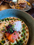 Нуссс вкусно. Сегодня был завтрак с яичком, курниными сосисками, бекончиком, картохой и овощичками. Однозначно рекомендую попробовать. Попить было дадено нитро-шмитро кофе холодный маракуя-шмуя тутуя-мутуя ну в общем и целом на любителя не фанат я кофейных извращений)))) У них кстати есть какао с бородинским хлебушком вот тоже можно попробовать. На закусь просто о божечки сендвич из копченой курицы, вяленых томатов, сыра и ностальжи из детства по вкусу кириешек с беконом (это я про вкус зажаристого хлебушка). Так же принесли зажаристый, хрустящий драник с яйцом пошёл ты))), слабосоленой красной рыбой и соусом песто. Ребята это просто отвал конечностей как это вкусно…… Ну и на десерт кашка. Можно было не просить фсех добавок было бы достаточно карамелизированного банана, но блин ореховая паста, фисташки, голубики и пекан это прям комбо. Ещё интересно было как было сбалансировано сладость и радость этого блюда. Однозначно рекомендую зайти и попробовать хотя бы кофе. А и да отдельно респект за добродушных официантов и комплимент водички с лимоном. Правда там с бонусеками что-то случилось не дали. Ну, а так да долговато конечно готовят но не 40 мин. Кофе мин через 5, Мой ланч мин 20, кашку мин 25. Да все круто, нормальная выдача блюд. Рекомендую