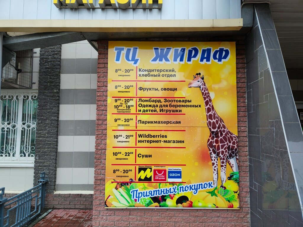 Магазин Жираф. Приятные магазинчики, есть и ломбард и суши и продовольственные товары, детский отдел, отдел для животных.