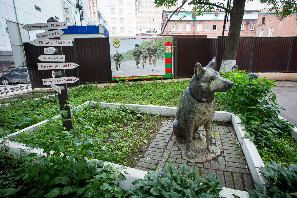 Памятник собаке по кличке "Ингус" пограничника Н.Ф. Карацупы Никита Фёдорович Карацупа (12.04.1910-18.11.1994 гг.) - Герой Советского Союза, полковник пограничной службы. Знаменит своими рейдами против нарушителей границы, во время которых он использовал хорошо обученных собак. В пограничных войсках с 1932 г. С 1933 г. проводник, инструктор служебных собак на пограничных заставах. Начав службу на границе в Приморье, он со своей собакой по кличке Ингус (первоначальное имя - Индус) стал настоящей грозой врагов, задержав 467 нарушителей, уничтожив 129 шпионов и диверсантов, с честью выйдя из 120 боевых столкновений. Собак у Карацупы в разное время было пятеро, а кличка у них у всех была одна. Ни один из Ингусов не был чистокровной овчаркой, и ни один из них не умер своей смертью - все погибли от боевых ран, в схватках с диверсантами. Памятник собаке Ингусу находится во Владивостоке у музея боевой славы Тихоокеанского пограничного округа.