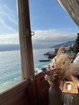Кафе имеет два уровня. На верхнем - прекрасный вид на море. 🫶 Может в сезон кафе и качает, но в конце октября это не пять звезд. Манты по ощущению подогреты в микроволновке, тесто сухое и твердое. Понравилась баранина и пита с баклажанами и сыром. Пиво закончилось на нас 🙈😁 могли предложить только сок и чай/кофе. По меню хотелось больше аутентичности. В общем, разочаровались, начитавшись отзывов.(