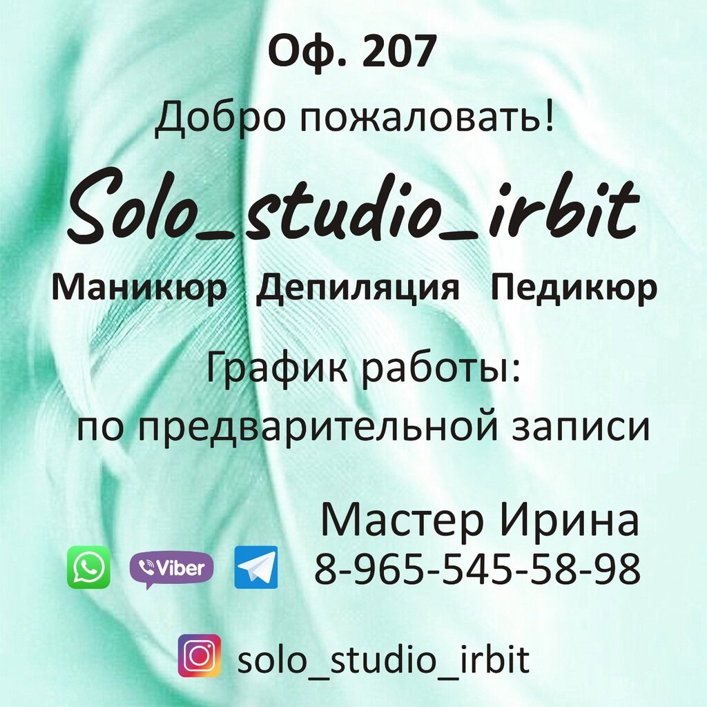 Всем доброго времени суток. Хочу поделиться впечатлениями о посещении салона "Solo". Так получилось, что в связи с переездом в Ирбитский район, пришлось искать мастера ногтевого сервиса. И мои новые знакомые поделились контаками данного салона. Попала к мастеру Ирине в очень плачевном состоянии: 1,5 месяца без "маника" и " ***" из-за переезда и все, что с ним связано (отросли на половину, что-то уже отвалилось, что-то отслоилось)... Честно говоря, было даже стыдно показывать сей кошмар мастеру. Ни слова не говоря, меня приветлтво встретили (что немало для первого раза) и привели мои конечности в ТАКОЕ состояние, что до сих пор нарадоваться не могу! И это при моей придирчивости и к кутикуле, и к форме и т. д и т. п. Подводя итог, хочу сказать огромное спасибо Ирине, и уж точно она теперь МОЙ мастер!