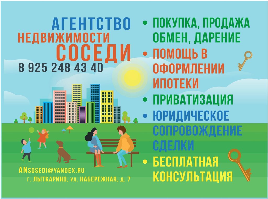 Если Вы продаете или покупаете сдаете, или снимаете квартиры комнаты дома или землю, то Вам точно нужно обратиться в агентство «Соседи» В этом агентстве берутся за самые сложные варианты и находят на них решения. Мы с сестрой продавали не самый лучший вариант недвижимости. Но благодаря нашему замечательному риелтору Юле нашелся покупатель и на нашу «убитую двушку». Причем она нам помогла получить такие справки при упоминании о которых у нас с сестрой опускались руки, но Юля нас подталкивала и результат не заставил себя ждать. Сделка состоялась. Может это звучит как лозунг, но скажу Обращайтесь к профессионалам – обращайтесь в агентство «Соседи» И в частности к замечательному риелтору Юле