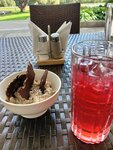 Шикарная летняя веранда с видом на фонтан и ивы! Меню приятное: жульен, котлета по-киевски: очень вкусно и уже подзабыто. А здесь вспомнили!!!