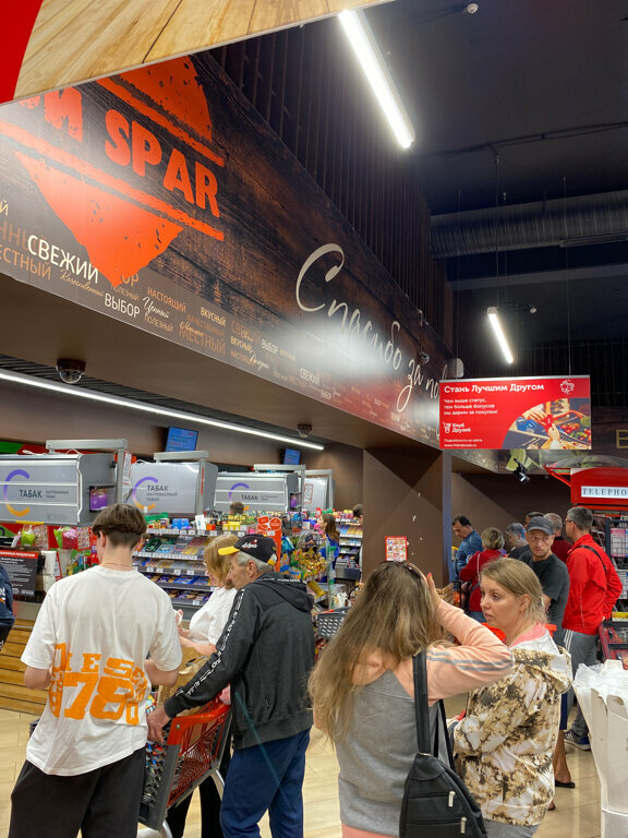 Обычный Spar, после закрытия Виктории человекопоток увеличился вдвое. Один огромный минус это кассы самообслуживания! Вы или совсем их закройте или выделите на них отдельного сотрудника, системе постоянно необходимо подтверждение сотрудника, работники кассы обслуживают других клиентов и процесс поиска свободного растягивается на впустую потраченные 10-15 минут, очередь растет, отношение к магазину падает.