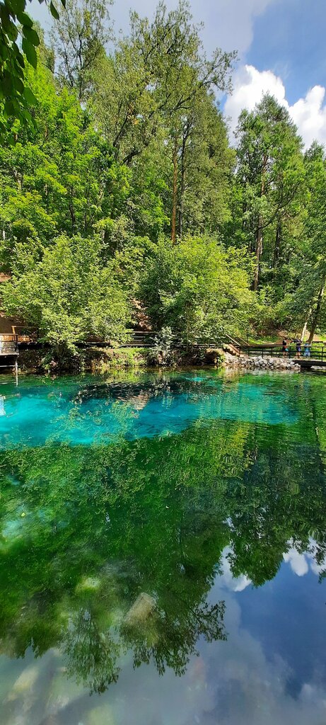 Фото не передаёт всей красоты. Вода действительно голубая и прозрачная как слеза. Обустроенные купели, есть лестницы для спуска в воду, ведра для обливания, кабинки для переодевания. Мужчины окунаются, я не смогла и двух секунд в воде простоять, воды ледяная, ключевая. Были в начале августа 2024 года, парковая зона активно обустраивается, набережная облагораживается.