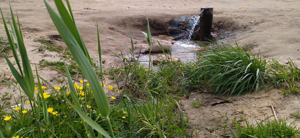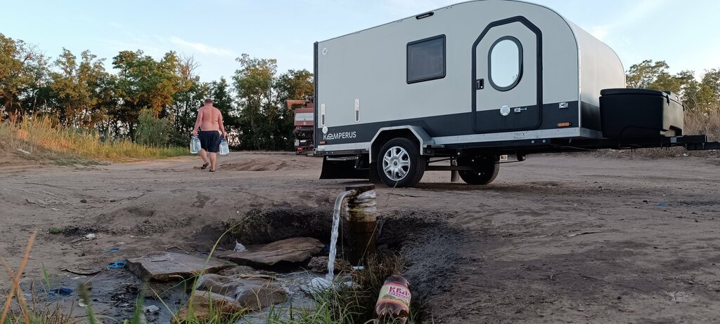 Не далеко от проезжей части, много машин подъезжает набрать воды. Вода чистая, мы набрали тоже. Дорога проезжабельная, ближе к колонке - в ямках. На другую сторону можно проехать в столовую