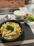 Посетили данное заведение 24 августа 2025 года, опираясь на отзывы, и остались не очень довольны. Посадка в зале была неполной, но официантов приходилось искать. Блюда были несоленые от слова «совсем» (могу предположить, что это особенность национальной кухни), и эта проблема легко решается солонкой на столе, но таковой у нас не оказалось. Чтобы добыть соль на стол, пришлось просить двух официантов с периодичностью в 10 минут, принесли нам её, когда уже в принципе было не нужно. Второе — паста, она должна быть сливочной, но, увы, она оказалась пресной, дети есть не стали. Туалетная комната грязная, бумага вываливается из урн, валяется вокруг, а также рядом с раковинами. Хотелось бы отметить, что были мы не поздней ночью, а в 16 часов. В общем, остался осадочек.