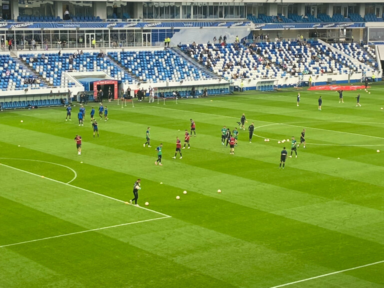 Стадион большой, вместительность 35 тысяч зрителей, есть разные сектора, можно купить покушать, попить горячего если вам прохладно. Есть много разных точек, где вы можете купить атрибутику фанатов клуба, ассортимент хороший. В общем все круто и продумано