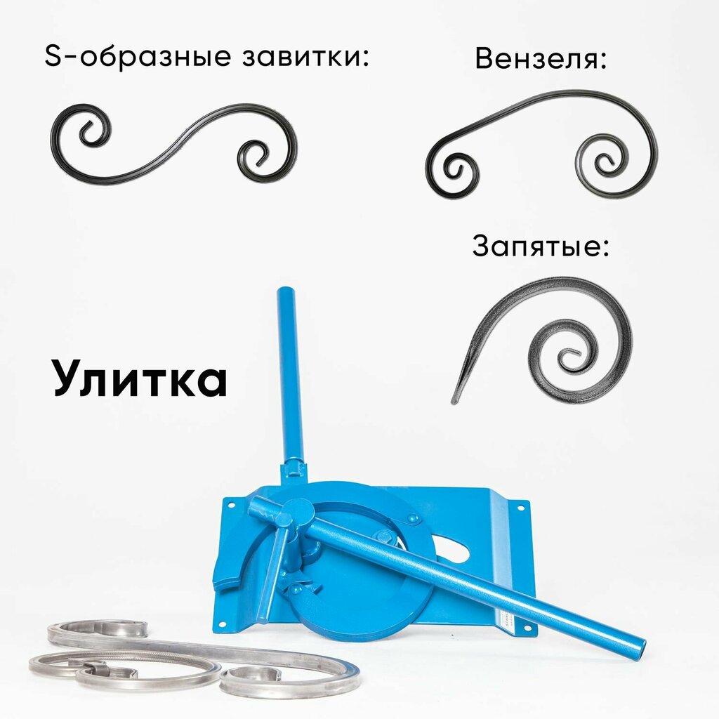Ручной станок для холодной ковки Улитка гнет обычные завитки, S-образные завитки, запятые и вензеля диаметром от 5 до 28 см. Материал для работы: Пруток, квадрат до 14х14 мм Полоса до 20х5 мм Усиленная профильная труба до 15х15 мм Насадка Мини-зав...