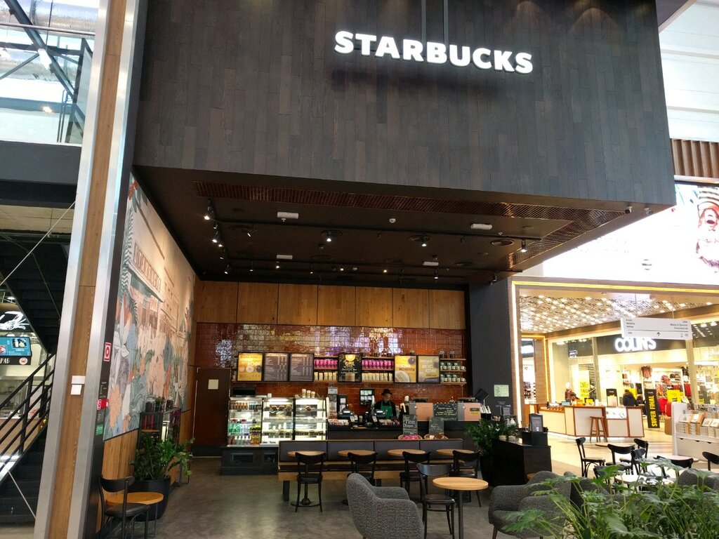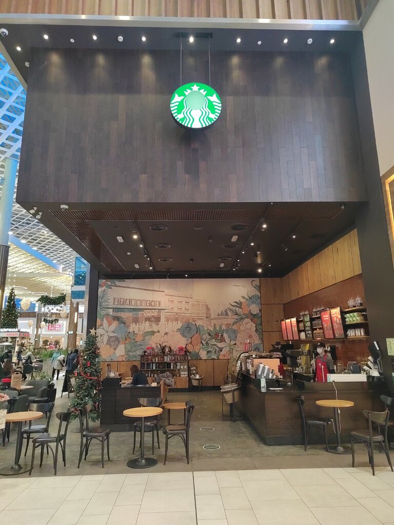 очень хорошая Звёздная кофейня американской сети starbucks сделано Круто как будто ты в Америке находишься персонал работает быстро качественно кофе вкусное огромный выбор булочки пироженки супер просто советую заходить сюда почаще