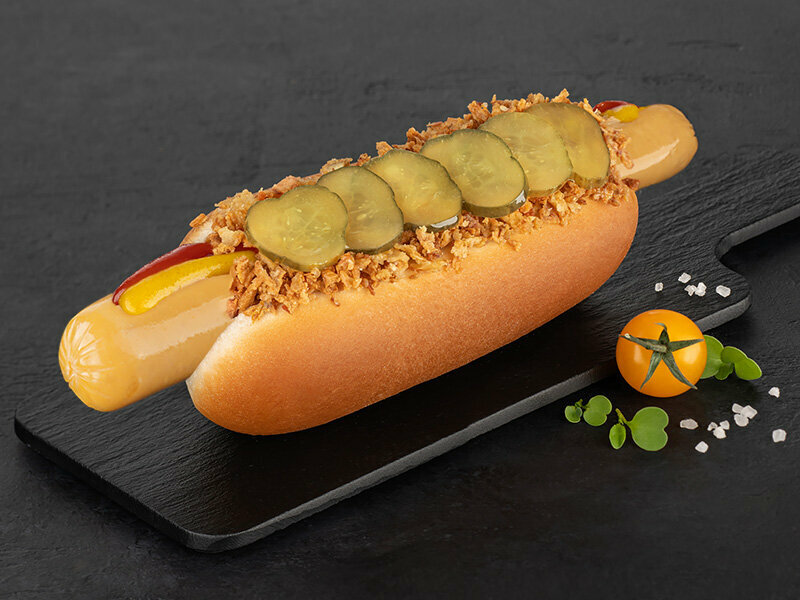 Ароматный датский хлеб, хрустящий жареный лук, фирменные огурчики, соусы и пикантные куриные сосиски — это настоящее наслаждение