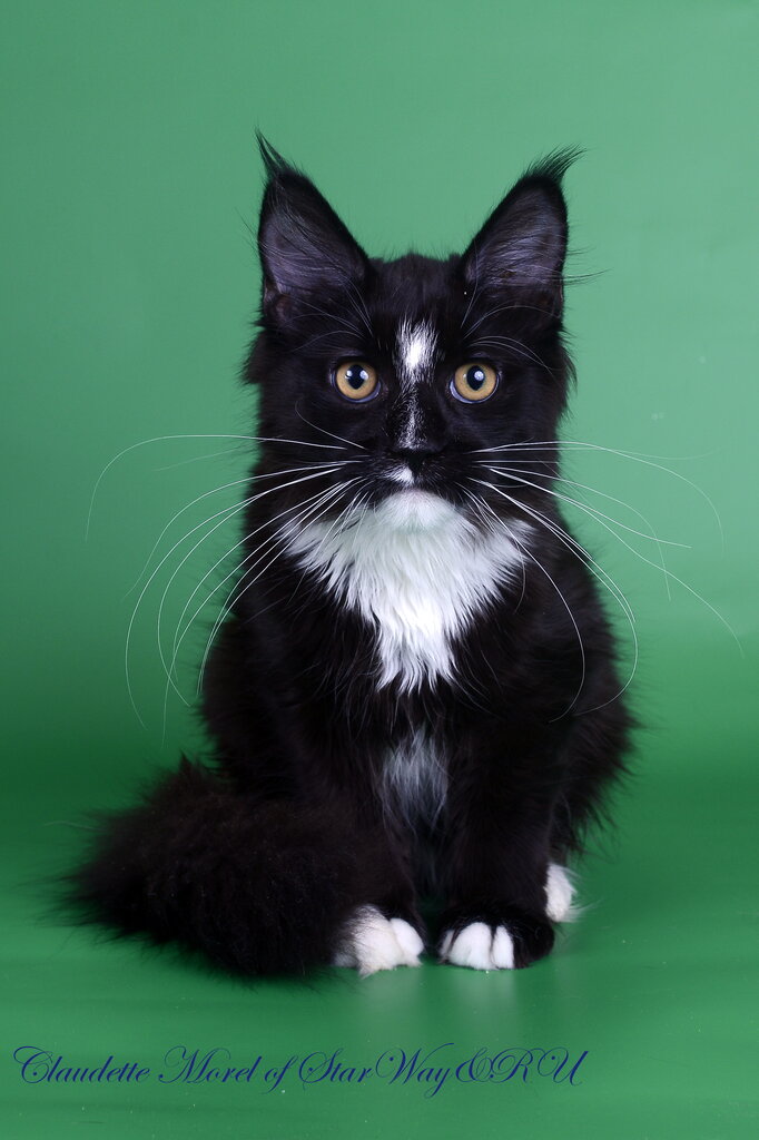 Предлагаем кошечку мейн кун Claudette Morel of StarWay*RU как домашнего любимца. Дата рождения 24.07.2018г Окрас черный с белым. Папа Европейский Чемпион Catsvill County`s Cliff Мама StarWay’s Santana. Наидобрейшая, ласковая, ручная черная крас