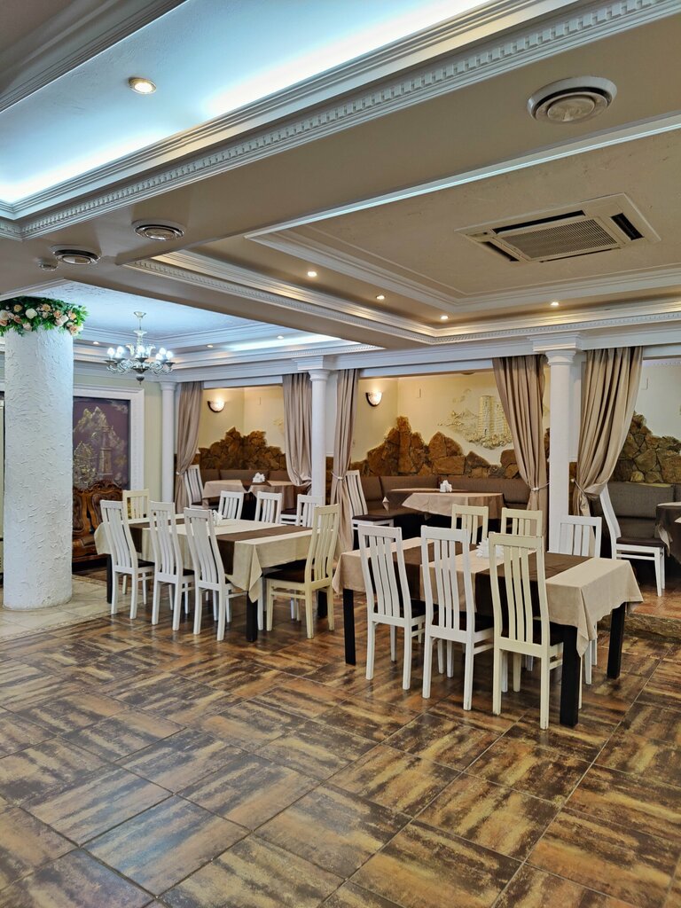 Шикарно! Отличная еда, все свежее и очень вкусное. Как и везде на Кавказе, еда с углей бесподобна, ну и конечно традиционные блюда на высоте. Одна особенность, нельзя и минусом то назвать - алкоголь только в целых бутылках, не под розлив. Отдельные беседки под группы людей и мала до велика. Также внизу большой зал, видимо для праздников и свадеб.