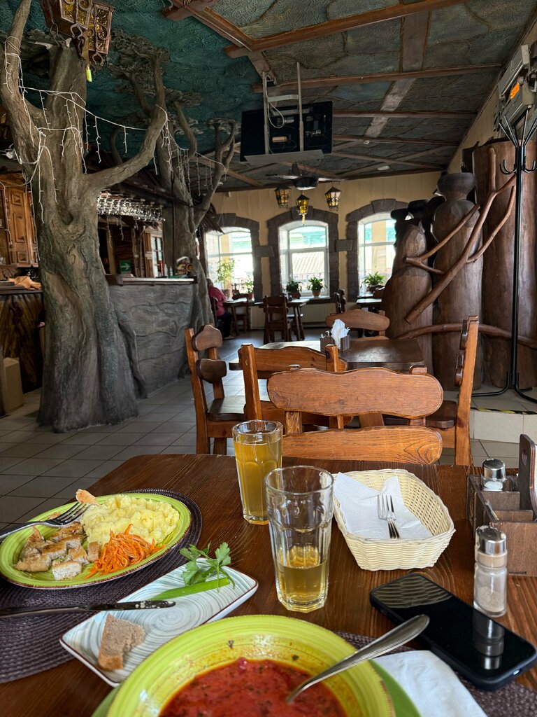 Вас там не ждут. Ради интереса зашли на 2 этаж с дочкой, нас оттуда по-хамски выгнали. Мы думали у них несколько залов, как в Корчме. Цены выше среднего с претензией на качество. Туалет просто жесть. Как в больнице. Стоят ведра и швабры. Надеюсь нас не отравили. Отбивную дожарили со второго раза. Правда второй раз забыли посолить. Щучьи котлеты все в панировке и масле. Мяса не чувствуется. Борщ вкусный. Отбивная 400р. Гречка 150р Остальное не помню. Отдельно хочется добавить ленты от мух в центре зала в октябре. Кафе работает на поминки и свадьбы. Поэтому ждать чего-то особенного не стоит.