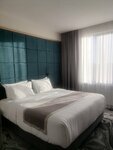 The hotel really lives up to its name and declared stars! There is a large parking lot on site, a beautiful interior and a pleasant aroma inside the hotel, the reception staff greets and accompanies with a smile, I want to come back again!) The room was on the 8th floor - 802 - the room itself is warm, cozy, very comfortable bed, spacious wardrobe, tea station, bottled drinking water, bathrobes, slippers, safe, air conditioning, refrigerator, TV, shower in the bathroom. A pleasant surprise awaited us at the entrance - a fruit plate, nice, thank you!!! The breakfast buffet is varied - fresh fruits, sliced vegetables, sausages, cheeses, pickled vegetables, olives, slices of red fish, red fish quiche, baked vegetables, bacon, cheesecakes, pancakes, coffee machine (I liked the coffee). For dinner, we ordered 2 servings of pancakes: with veal cheeks and smoked trout - it's amazing, I recommend you try it.