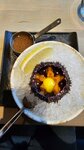 Дымный тартар из говядины с картофельным гратеном и эспумой из жареного лука