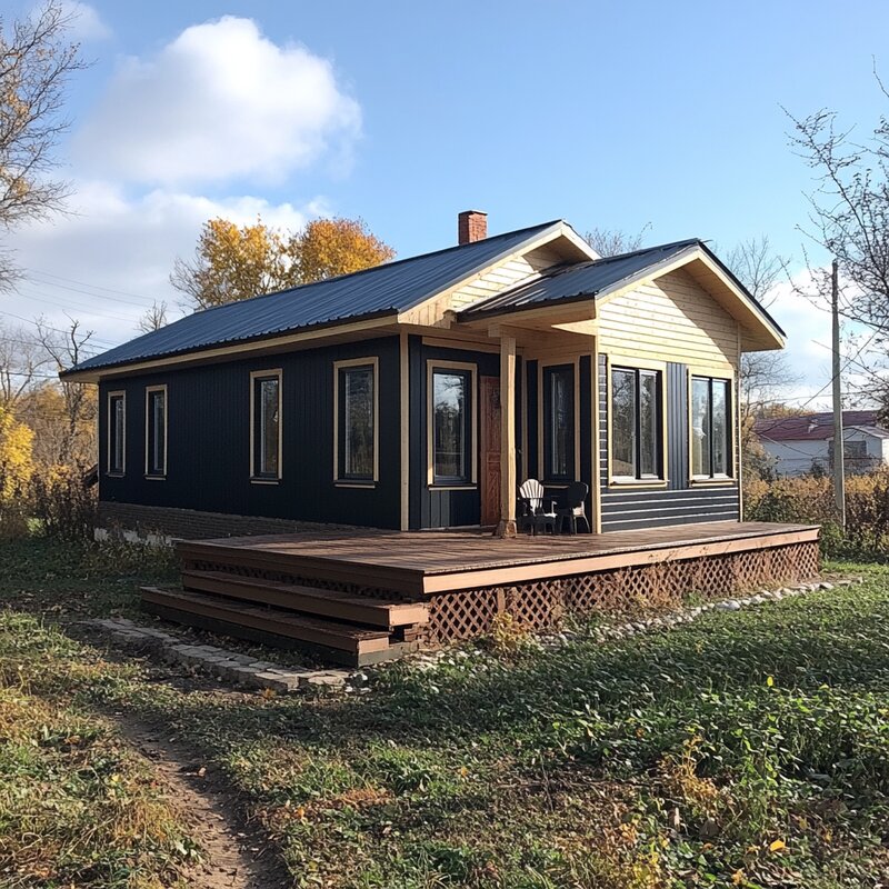 Характеристики : Дом каркасный Этажей-1 Общая площадь — 36,0 кв.м Размеры дома — 6,0 x 6,0 м. Количество комнат — 3 Терраса — есть Отделка — имитация бруса Комплектация Лето-Осень