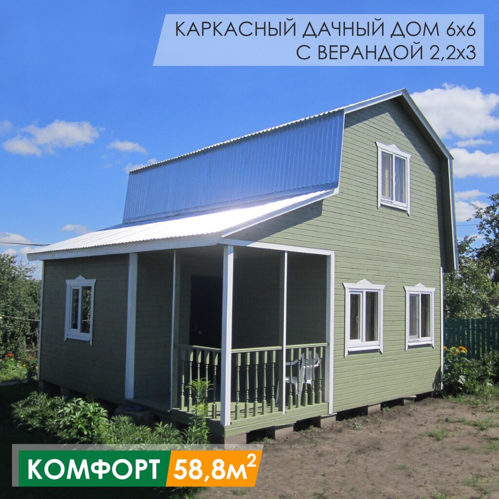 Строительство каркасных домов под ключ. Общая площадь: 58,8 м2 Площадь под застройку: 36,0 м2 Размер дома: 6,0 м x 6,0 м Веранда: 2,2х м x 3,0 м Терраса: 2,2 м x 3,0 м