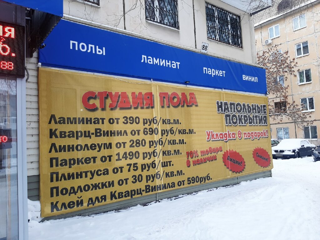 Заказывала себе в данном магазине кварцвинил. Качество отличное, доставили все быстро. Когда выбирала себе напольные покрытия, объездила всю Самару, но так и не подобрала ничего подходящего. В других магазинах нужно было ждать 1-2 месяца и цена была значительно выше. А в "студии пола" очень большой выбор различных напольных покрытий (ламинат, кварцвинил и тд), подходящая цена. Также у них есть межкомнатные двери. И ещё, в данном магазине очень грамотные консультанты, которые помогут определиться с выбором. Я осталась очень довольна покупкой в данном магазине.