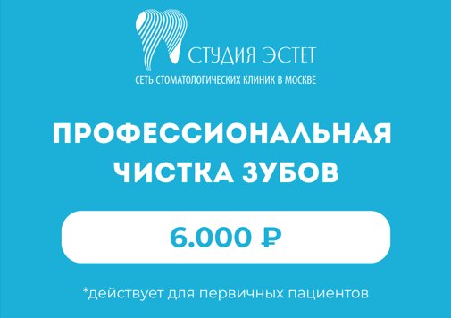 ПРЕДЛОЖЕНИЯ ДЛЯ НОВЫХ ПАЦИЕНТОВ В «СТУДИИ ЭСТЕТ» Профессиональная чистка зубов всего за 6 000 ₽ Акция действует только для новых первичных ...