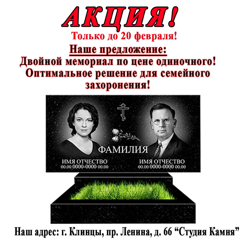 Двойной памятник по цене одиночного! Вы платите как за одиночный памятник, а взамен получаете-гравировку двух портретов,текста,оформления ....