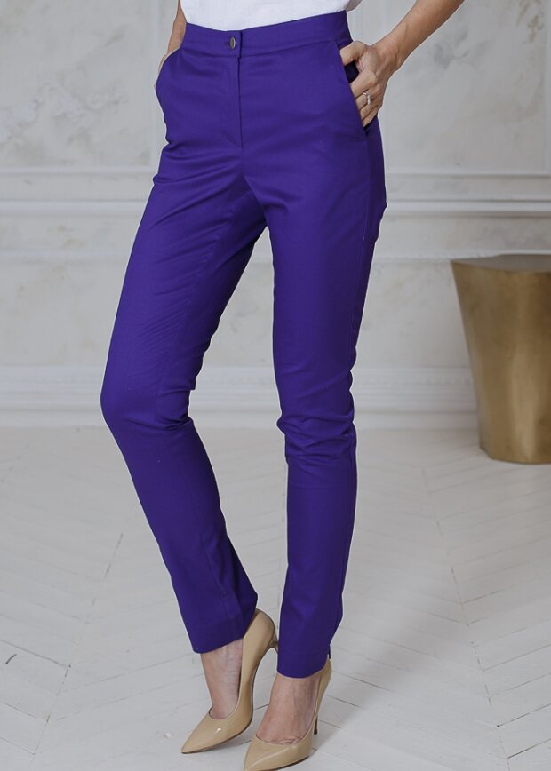 Брюки женские, зауженные, с притачным поясом. Передние половинки брюк с имитацией застежки "гульф" в среднем шве, с боковыми карманами в отрезных бочках. Задние половинки брюк с кокетками, с накладными карманами, настроченными двумя параллельными с