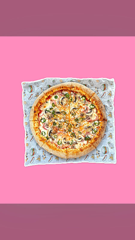 Состав: натуральный сыр моцарелла, томатный соус, ветчина из индейки, колбаски салями, пеперони, охотничьи .