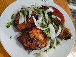 Очень гостеприимный хозяин! Вкусный шашлык и салат из печёных овощей. Оформлено красиво.