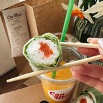 Лосось, сыр мягкий, огурец, японский омлет, лук зеленый, кунжут, острый соус