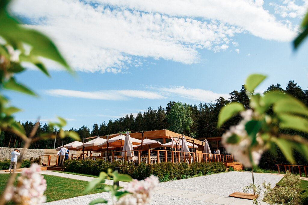 Плюсы: красивая уютная территория под проведение свадеб, аккуратно ухоженные газоны и дорожки, официанты топ. Минусы: крыша над шикарной летней верандой сделана из поликарбоната и она потекла по время дождя - капнуло в бокал. Поликарбонат на крыше мутно грязный, соответственно если посмотреть наверх видно грязь, которая капает на одежду и оставляет разводы. Не уверен, но еда похоже привозная, разогрета на месте - уточняйте, могу ошибаться В общем место отличное, но с крышей веранды просто позор, сильно портит впечатление, мы же не в теплице